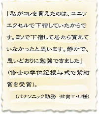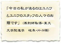 私たちは、ユニワエクセルで学生生活を過ごした卒業生から こんな言葉を贈られています。 この言葉を宝物だと思って毎日励んでいます。 |